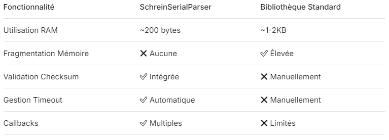 SchreinSerialParser parser(mySerial);đ Utilisation Basique